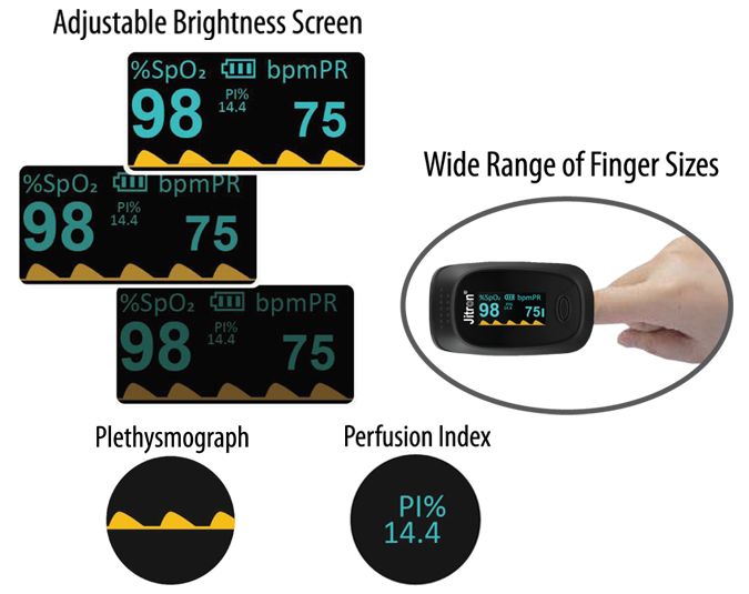 The Jitron OxyCHECK Fingertip Pulse Oximeter JPO-707A is intended for measuring the functional oxygen saturation and pulse rate through the patient’s finger. It is applicable for spot-checking SpO² and pulse rate of adult and pediatric patients in homes and clinics.